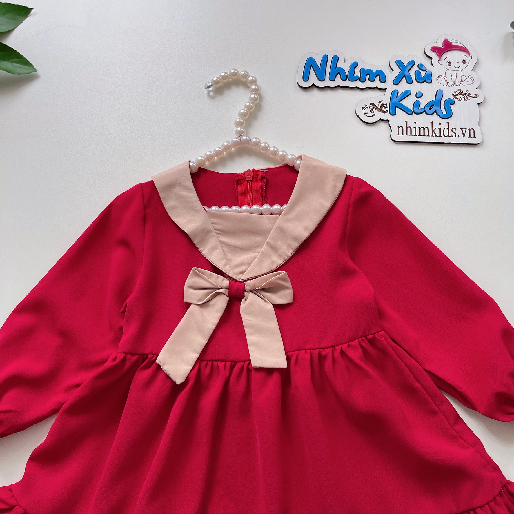 Váy đỏ phối cổ be tay dài chất đũi chun xinh yêu cho bé gái 4 đến 32kg