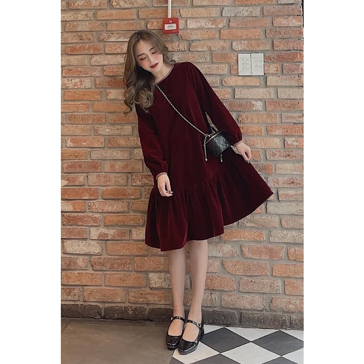 Váy bầu bigsize chất dạ nhung siêu cấp Đầm nữ tiểu thư dáng suông rộng che khuyết điểm mặc đi chơi dạo phố du lịch