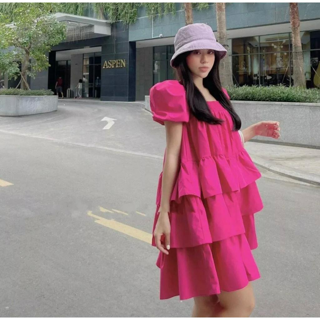 Váy babydoll cổ vuông xòe 3 tầng bo chun chất thô màu xanh hồng, đầm tiểu thư tay bồng đi chơi đi biển dự tiệc hottrend