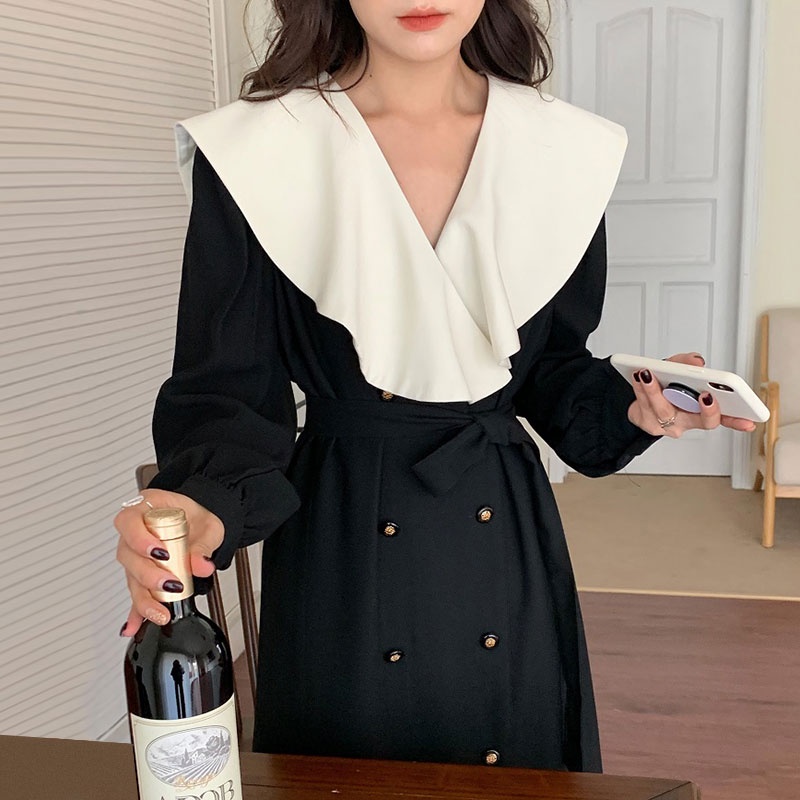 Váy dài tay kiểu Pháp, cổ phối bèo rộng màu trắng, thon eo cài khuy style sang trọng vintage