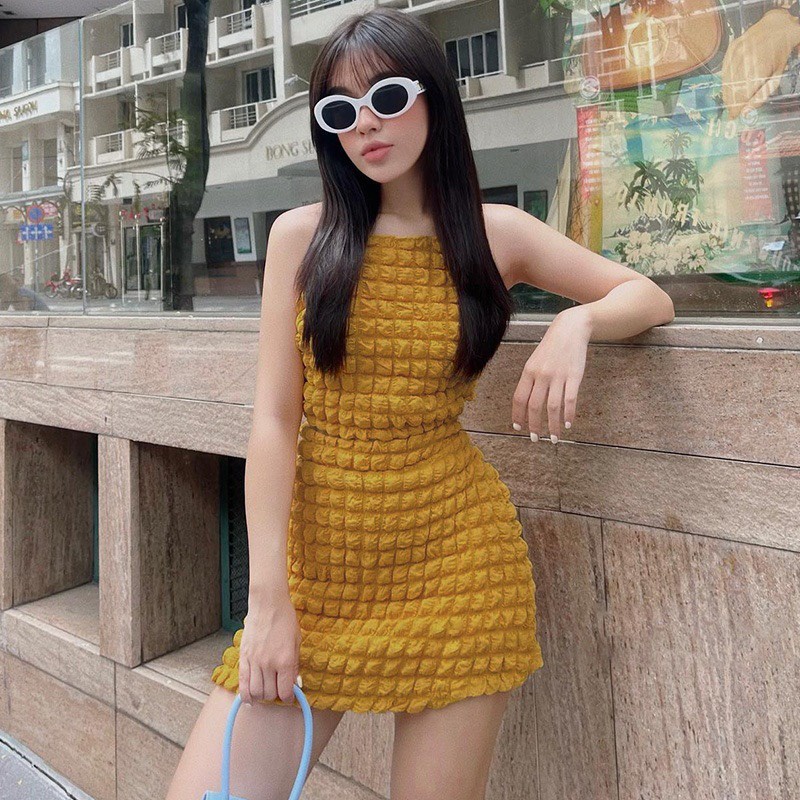 Đầm váy nữ cổ yếm 3 màu siêu xinh họa tiết hở lưng quyến dũ cực sang trọng dự tiệc dạo phố quý phái