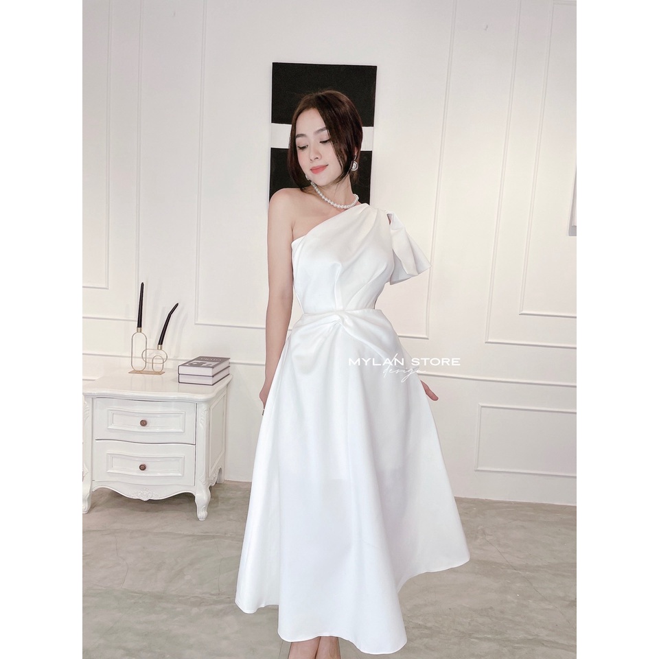 Đầm Thiết Kế Phối Trễ Vai Đính Nơ Cổ, Váy Dự Tiệc Chất Liệu Tafta Tiểu Thư
