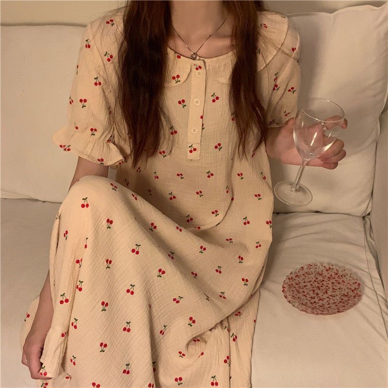 Váy ngủ - đầm dài qua gối vải xô muslin cao cấp mềm mại, tay ngắn phồng đáng yêu, họa tiết xinh xắn
