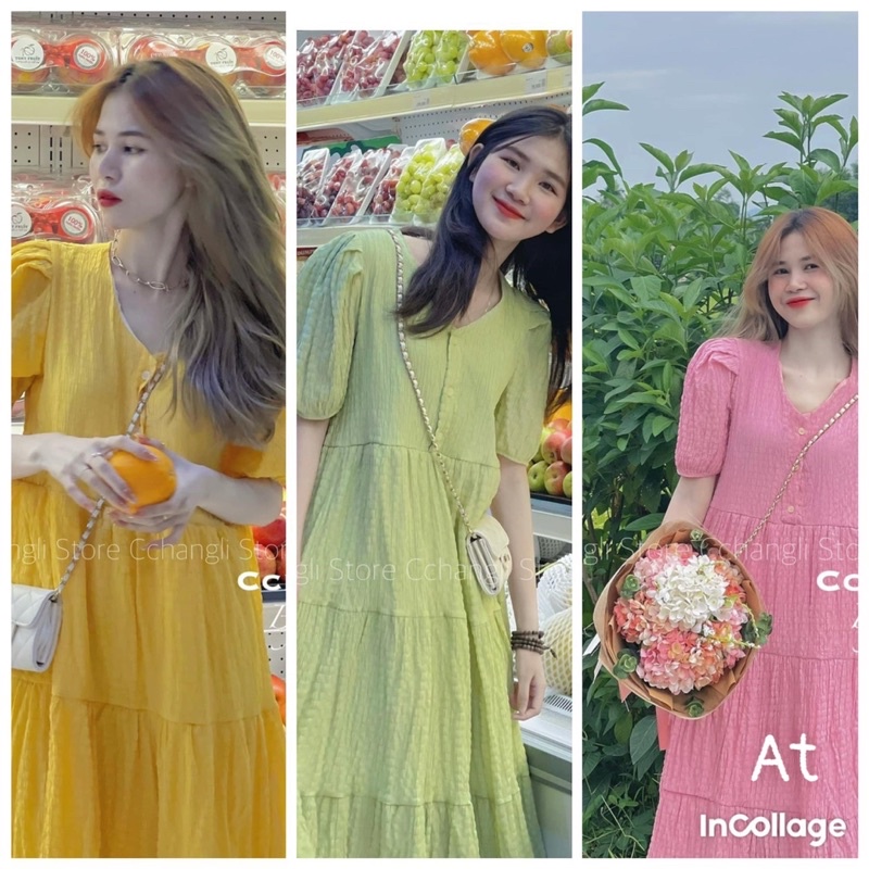 VÁY SUÔNG XỐP CỔ TIM DÁNG DÀI 3 màu xanh, vàng, hồng