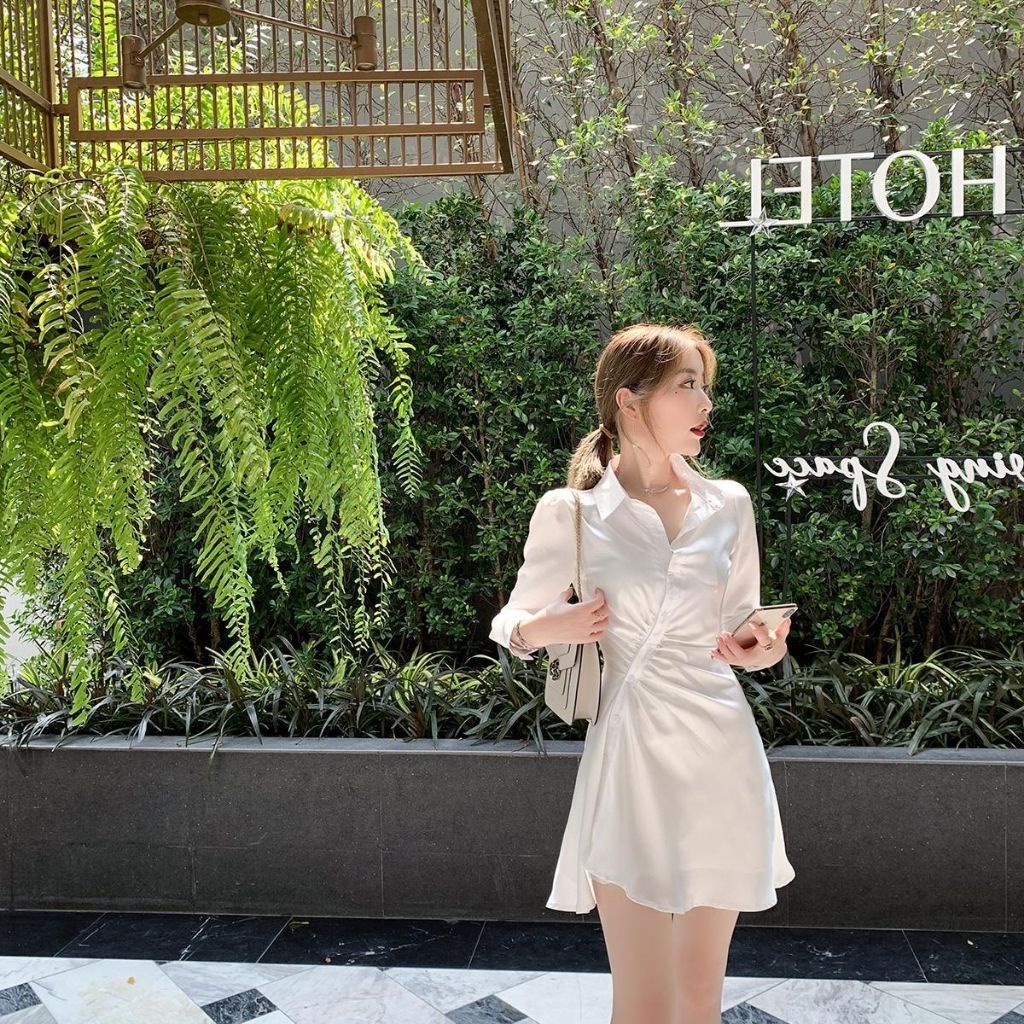 Váy Trắng , Đầm Dự Tiệc Sơ Mi Nhún Eo , Dáng Ngắn , Ôm Body Vải Lụa Cao Cấp Phong Cách Hàn Quốc