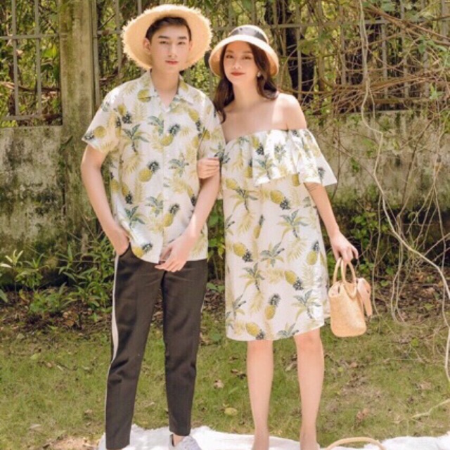 Váy trễ vai bèo ngực - set đồ đôi hoa quả đi biển đi chơi