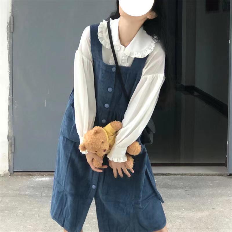 Váy yếm Bộ Áo Sơ Mi Cổ Búp Bê + Váy Yếm Dáng Rộng Phong Cách Retro Nhật Bản Cho Nữ