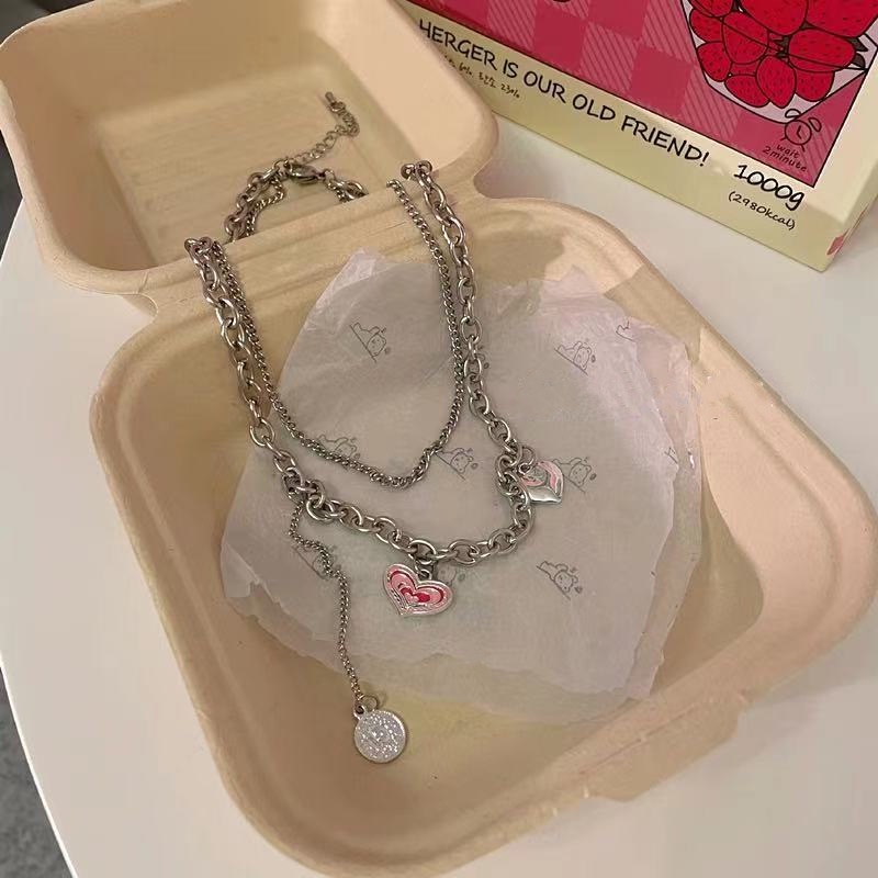 Vòng cổ Mặt Trái Tim Đôi Màu Hồng Phong Cách Hip hop Hàn Quốc