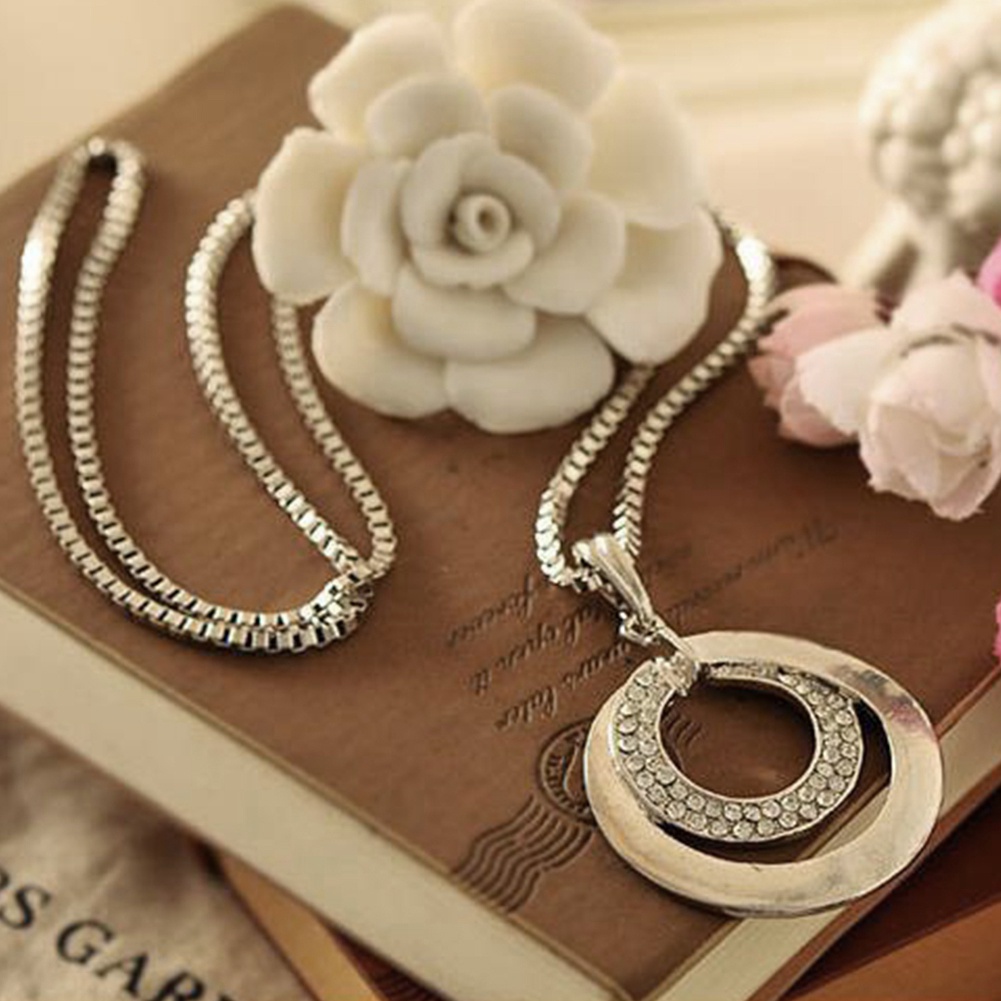 Specifications: With double circles pendant with rhinestone inlaid, elegant and all-match. Simple style, easy to match with your dress or tops. Suitable for self-wearing or as gift for your friends. Type: Necklace Gender: Womens Style: Fashion Material: Allo