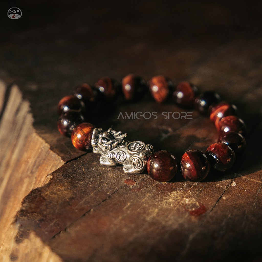 Vòng tay phong thủy handmade đá mắt hổ đỏ mix charm Tỳ Hưu Bạc