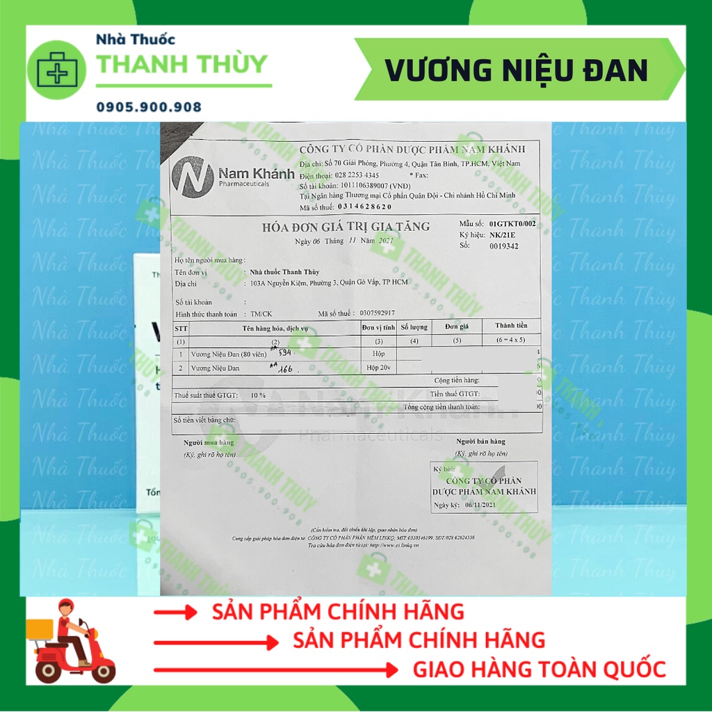 ► CAM KẾT CỦA NHÀ THUỐC THANH THUỲ - 100% Sản Phẩm Chính Hãng, Có Tem Nhà Sản Xuất - Sản Phẩm Đều Có Giấy Chứng Nhận, Hóa Đơn Đỏ. - Dược Sỹ Tư Vấn Miễn Phí Trong Quá Trình Sử Dụng Để Đạt Hiệu Quả Tốt Nhất - Đổi Trả Hàng Trong 10 Ngày Nếu Giao Hàng Không Đúng Như Thông Tin Sản Phẩm - Ship Cod Toàn Quốc, Quý Khách Được Kiểm Tra Hàng Tại Nhà Rồi Mới Thanh Toán - Sản Phẩm Luôn Có Hạn Sử Dụng Dài VƯƠNG NIỆU ĐAN - Hỗ Trợ Giảm Tình Trạng Tiểu Đêm, Tiểu Nhiều Lần, Tiểu Són, Tiểu Gấp, Tiểu Không Tự Chủ Vương Niệu Đan là thực phẩm bảo vệ sức khỏe (thực phẩm chức năng) hỗ trợ giảm co thắt, tăng độ co giãn cho bàng quang, kiểm soát chứng rối loạn tiểu tiện: tiểu đêm, tiểu nhiều lần, tiểu són, tiểu gấp, tiểu không tự chủ an toàn hiệu quả. THÀNH PHẦN - Chiết xuất từ Varuna (Crateva nurvala extract) - Cỏ đuôi ngựa Horsetail (Equisetum arvense extract) - Ô dược (Lindera aggregata extract) - VispoTM (chiết xuất Cọ lùn – Saw Palmetto extract) 90 mg - Chiết xuất hạt bí đỏ (Pumpkin seed extract) 90 mg - Cao Nữ lang (Valeriana officinale extract) 50 mg - Phụ liệu: Lactose, avicel 102, polyvinyl alcohol (PVA), sodium starch glycolat (DST), talc, magnesium stearate, aerosil, HPMC E6, PEG 6000, talcum, titanium dioxide, ethanol vừa đủ 900 mg. CÔNG DỤNG Hỗ trợ giảm kích thích bàng quang, giúp cải thiện tình trạng tiểu đêm, tiểu nhiều lần, tiểu gấp, tiểu són, tiểu không tự chủ. ĐỐI TƯỢNG SỬ DỤNG Dùng cho cả nam và nữ có chức năng bàng quang kém gây tiểu đêm, tiểu nhiều lần, tiểu gấp, tiểu són, tiểu không tự chủ. HƯỚNG DẪN SỬ DỤNG - Ngày dùng 4 viên, chia 2 lần, uống vào buổi sáng và buổi tối. Uống sau ăn 30 phút. - Nên dùng duy trì từ 2 - 3 tháng. - Nên kết hợp với chế độ sinh hoạt điều độ, tăng cường các bài tập thể dục tốt cho cơ sàn chậu, hạn chế uống nhiều nước vào buổi tối trước khi đi ngủ để đạt được hiệu quả tốt nhất. SẢN PHẨM NÀY KHÔNG PHẢI LÀ THUỐC, KHÔNG CÓ TÁC DỤNG THAY THẾ THUỐC CHỮA BỆNH Hộp 2 vỉ x 10 viên nén Lọ 80 viên nén #vuongnieudan #thucphamchucnangvuongnieudan #vienuonghotrotieudem #vienuongvuongnieudan #roiloantieutien #tieudem #tieunhieulan #tienson #tieugap #tieukhongtuchu #colun #caonulang #coduoingua #oduooc #vuong_niệu_đan #tiểu_đêm