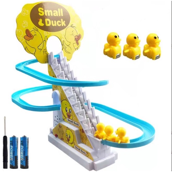 BỘ ĐỒ CHƠI VỊT LEO CẦU THANG SIÊU QUẬY CHO BÉ CÓ NHẠC VÀ ĐÈN NHÁY - Tên sản phẩm: Đồ chơi vịt vàng leo cầu thang - Bộ sản phẩm gồm: 3 Chú VỊT vàng, 1 cầu thang, 1 biển chào, 3 đường ray - Kích thước: 20 x 15 x 6cm - Chất liệu: Làm từ nhựa ABS an toàn và sử dụng Pin