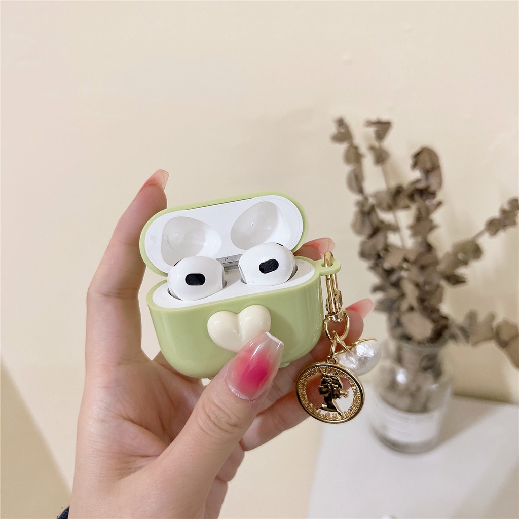 Vỏ Bảo Vệ Hộp Sạc Tai Nghe AirPod 1/2/3 Pro 1/2/3 Bằng Silicon Màu Trắng/Xanh Lá Phối Mặt Dây Hình Trái Tim Dễ Thương