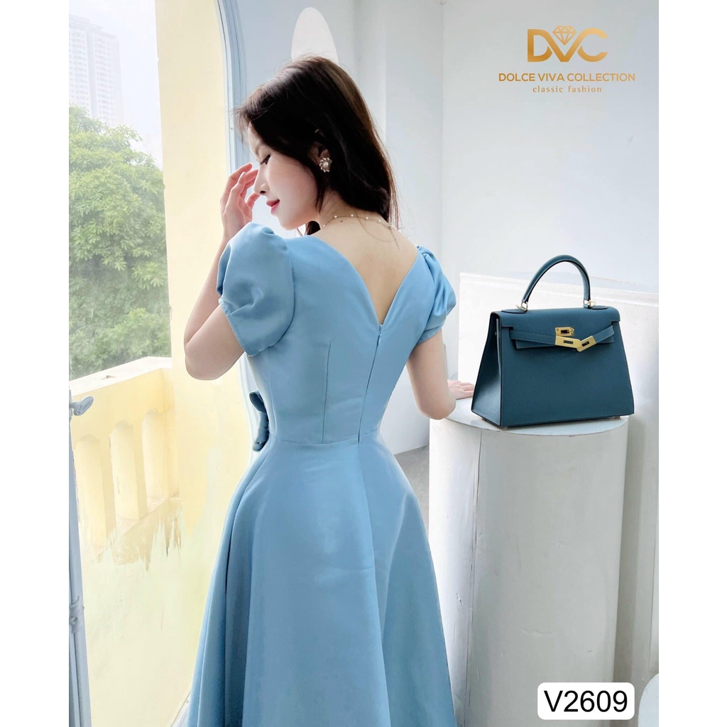 V2609 váy xanh tafta cổ v tay phồng dự tiệc sang chảnh - Dolce viva colection
