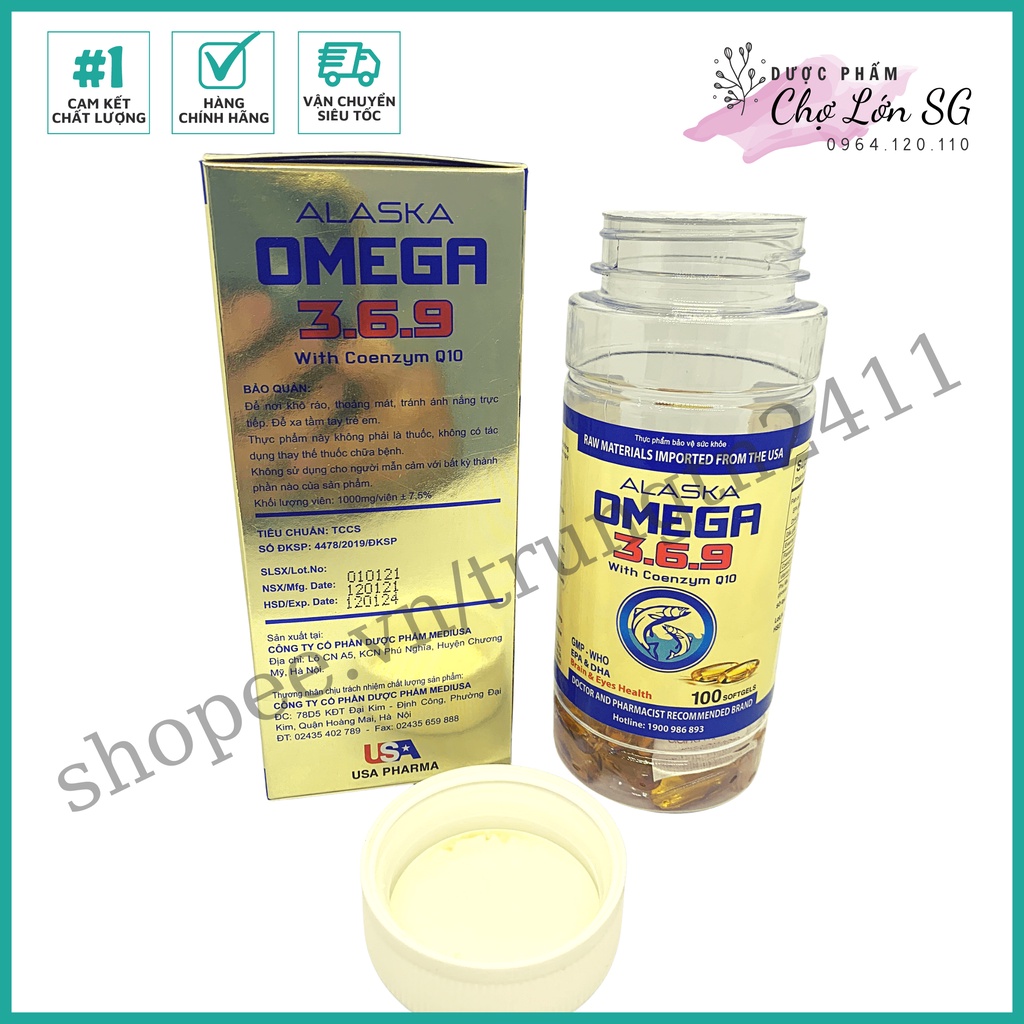 # THÀNH PHẦN: - Fish oil - 1000mg - EPA ( eicosapentaenoic acid) - 180mg - DHA - 120mg - Coenzym Q10 - 10mg - Vitamin E - 20IU # CÔNG DỤNG - Viên dầu cá Alaska Deep Sea Fish Oil Omega 3 với thành phần chính là dầu cá, EPA, DHA và Vitamin E là thực phẩm chức năng có tác dụng cung cấp Omega 3 cho cơ thể. - Hai thành phần Axit béo trong Omega 3 bao gồm EPA (Acid Eicosapentaenoic) và DHA (Acid Docosahexanoic) có tác dụng bảo vệ sức khoẻ tim mạch, điều hoà lượng Cholesterol, cải thiện chứng rối loạn mỡ máu do yếu tố di truyền, giảm loạn nhịp tim, ngăn ngừa bệnh động mạch vành, giảm chứng nhồi máu cơ tim. - Đồng thời, dầu cá cũng giúp bổ sung dưỡng chất cho não, cải thiện trí nhớ, tăng cường thị lực, chống oxy hóa tế bào.Sản phẩm không chứa chất bảo quản, chất tạo màu, hương liệu, đường..., phù hợp với người thị lực kém, người bị xơ vữa mạch máu hoặc mắc các bệnh về tim mạch. # ĐỐI TƯỢNG SỬ DỤNG - Người lớn và trẻ em trên 6 tuổi # CÁCH DÙNG - Người lớn mỗi ngày uống 2 viên sau bữa ăn - Trẻ em trên 6 tuổi uống 1 viên sau bữa ăn # HƯỚNG DẪN BẢO QUẢN - Nơi khô mát, tránh ánh sáng trực tiếp. # KHUYẾN CÁO - THỰC PHẨM NÀY KHÔNG PHẢI LÀ THUỐC VÀ KHÔNG CÓ TÁC DỤNG THAY THẾ THUỐC CHỮA BỆNH. - KHÔNG DÙNG CHO NGƯỜI CÓ MẪN CẢM VỚI BẤT KỲ THÀNH PHẦN NÀO CỦA SẢN PHẨM. Thương nhân chịu trách nhiệm về sản phẩm và phân phối: CÔNG TY CỔ PHẦN DƯỢC PHẨM MEDIUSA Địa chỉ: 78D5, KĐT Đại Kim - Định Công, phường Đại Kim, quận Hoàng Mai, thành phố Hà Nội, Việt Nam. Sản xuất tại: CÔNG TY CỔ PHẦN DƯỢC PHẨM MEDIUSA Địa chỉ: 78D5, KĐT Đại Kim - Định Công, phường Đại Kim, quận Hoàng Mai, thành phố Hà Nội, Việt Nam. CAM KẾT HÀNG HÓA ĐÚNG CHẤT LƯỢNG, ĐÚNG HÀNG CÔNG TY VÀ MẪU MÃ SẢN PHẨM NHƯ HÌNH ẢNH. BÁN HÀNG UY TÍN, TẠO DỰNG NIỀM TIN VỚI KHÁC HÀNG LÀ TIÊU CHÍ ĐẦU TIÊN CỦA CỬA HÀNG.