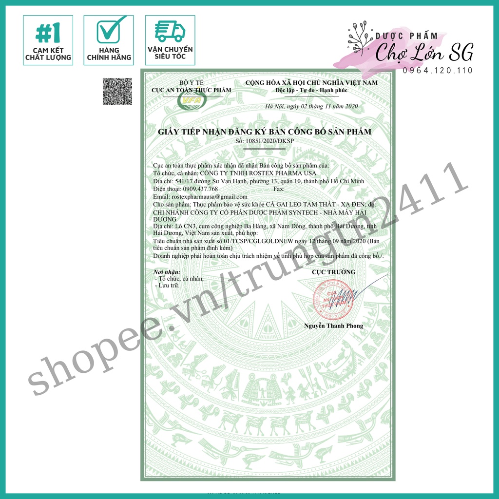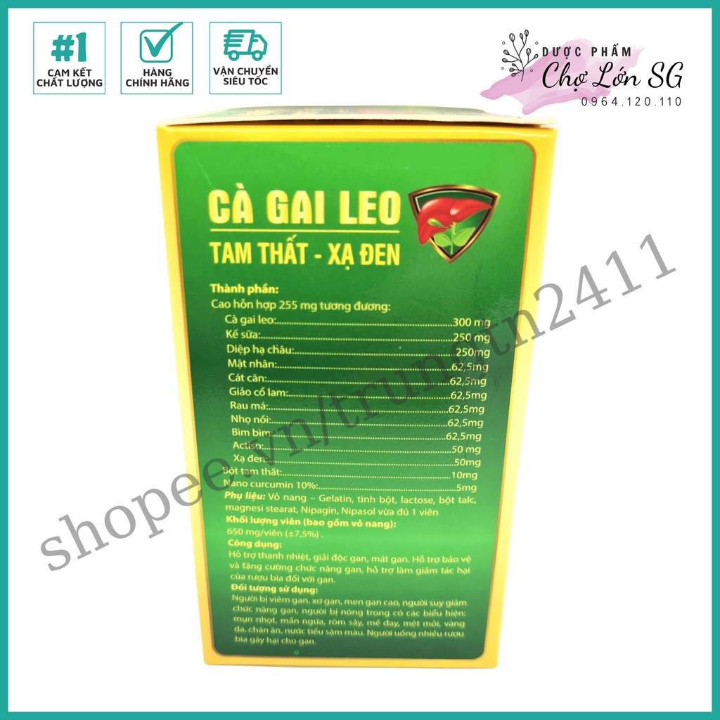 # THÀNH PHẦN: - Cà gai leo: 300mg - Kế sữa: 250mg_Diệp hạ châu: 250mg - Mật nhân: 62,5mg_Cát căn: 62,5mg - Giảo cố lam: 62,5mg_Rau má: 62,5mg - Nhọ nồi: 62,5mg_Bim Bim: 62,5 mg - Acitso: 50mg_ Xạ đen: 50mg - Bột tam thất: 10mgNano curcumin 10%: 5mg # CÔNG DỤNG - Tốt cho gan , bổ gan , cải thiện chức năng gan- Thanh nhiệt mát gan, bảo vệ tế bào gan. - Tăng cường chức năng giải độc của gan.- Giúp bảo vệ tế bào gan, hạn chế tổn thương tế bào gan do rươu, hóa chất độc hại gây nên. - Tăng cường chức năng gan trong các trường hơp: viêm gan, xơ gan, gan nhiễm mỡ, men gan cao.- Làm mát gan, thanh lọc cơ thể, hạ men gan. # ĐỐI TƯỢNG SỬ DỤNG - Người thường xuyên phải sử dụng rượu bia hằng ngày-Người bị vàng da , mẩn ngứa ,táo bón , tiểu vàng - Người bị suy giảm chức năng gan do xơ gan , viêm gan-Người có men gan cao do chức năng gan suy yếu # CÁCH DÙNG - Uống 2 viên / lần , ngày 2-3 lần # HƯỚNG DẪN BẢO QUẢN - Nơi khô mát, tránh ánh sáng trực tiếp. # KHUYẾN CÁO - THỰC PHẨM NÀY KHÔNG PHẢI LÀ THUỐC VÀ KHÔNG CÓ TÁC DỤNG THAY THẾ THUỐC CHỮA BỆNH. - KHÔNG DÙNG CHO NGƯỜI CÓ MẪN CẢM VỚI BẤT KỲ THÀNH PHẦN NÀO CỦA SẢN PHẨM. Thương nhân chịu trách nhiệm về sản phẩm và phân phối: CÔNG TY TNHH ROS TEXPHARMA USA Địa chỉ : 541/17 Sư Vạn Hạnh , Phường 13 , Quận 10 , Tp .HCM Sản xuất tại: CHI NHÁNH CÔNG TY CỔ PHẦN DƯỢC PHẨM SYNTECH - NHÀ MÁY HẢI DƯƠNG Địa chỉ: Lô CN3, cụm công nghiệp Ba Hàng, xã Nam Đồng, thành phố Hải Dương, tỉnh Hải Dương, Việt Nam CAM KẾT HÀNG HÓA ĐÚNG CHẤT LƯỢNG, ĐÚNG HÀNG CÔNG TY VÀ MẪU MÃ SẢN PHẨM NHƯ HÌNH ẢNH. BÁN HÀNG UY TÍN, TẠO DỰNG NIỀM TIN VỚI KHÁC HÀNG LÀ TIÊU CHÍ ĐẦU TIÊN CỦA CỬA HÀNG.
