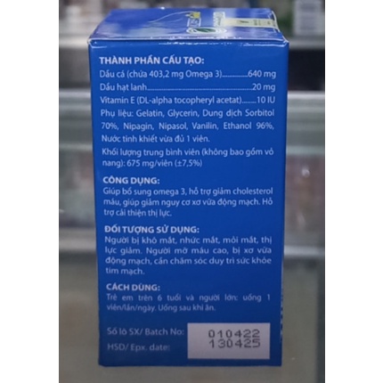 *** Viên uống Dầu cá OMEGA GOLD – Bổ sung OMEGA 3 Tốt cho mắt, tim mạch *** Dầu cá nhập khẩu từ Na Uy - Châu Âu ✅CÔNG DỤNG: - Giúp bổ sung Omega 3, hỗ trợ giảm cholesterol máu, giúp giảm nguy cơ vữa động mạch. - Hỗ trợ cải thiện thị lực. ✅ ĐỐI TƯỢNG SỬ DỤNG: - Người bị khô mắt, nhức mắt, mỏi mắt, thị lực giảm. - Người mỡ máu cao, bị xơ vữa động mạch, cần chăm sóc duy trì sức khỏe tim mạch. ✅ CÁCH DÙNG: - Trẻ em từ 6 tuổi trở lên và người lớn: uống 1 viên/lần/ngày. - Uống sau khi ăn. ✅ THÀNH PHẦN Dầu cá (Nhập khẩu từ Na Uy): 640mg (Chứa Omega 3: 403,2mg) Dầu hạt lanh: 20mg Vitamin E: 10IU Thực phẩm này không phải là thuốc, không có tác dụng thay thế thuốc chữa bệnh. Xuất xứ: Việt Nam Nhà sản xuất: CÔNG TY CỔ PHẦN DƯỢC PHẨM SYNTECH ************************** VINH HOA PHARMACY Cam kết: ✔️ Sản phẩm nguồn gốc xuất xứ rõ ràng ✔️ Date mới, bao bì nguyên vẹn ✔️ GIá tốt, tư vấn đúng, an toàn hiệu quả *** Hotline Dược sĩ Tư vấn: 0899536956