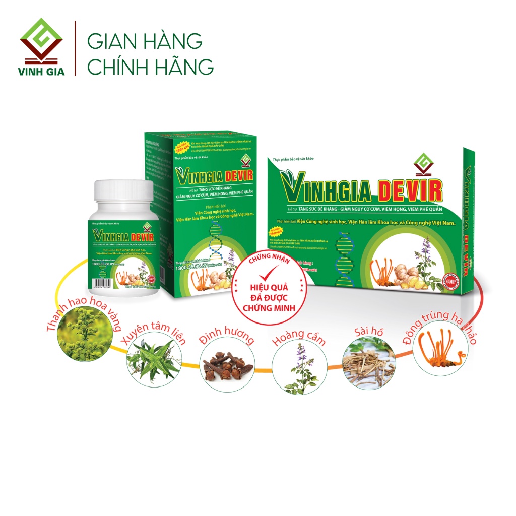 Viên Uống Hỗ Trợ Tăng Đề Kháng VINHGIA DEVIR Giúp Giảm Biểu Hiện Ho Đờm, Sốt Tăng Cường Sức Khoẻ Hộp 30 Viên 05OL006 1. THÔNG TIN SẢN PHẨM - Thương hiệu: VINHGIA DEVIR. - Xuất xứ: Việt Nam. - Quy cách hộp: Hộp 30 viên. - Hạn sử dụng: 3 năm. - Lưu ý: Sản phẩm này không phải là thuốc, không có tác dụng thay thế thuốc chữa bệnh. 2. THÀNH PHẦN - Cao xuyên tâm liên (tương đương 817mg thảo mộc thô): 81,7mg. - Cao thanh hao hoa vàng (tương đương 546mg thảo mộc thô): 54,6mg. - Bột đinh hương (tương đương 20,55mg thảo mộc thô): 13,7mg. - Cao hoa hòe (tương đương 1.125mg thảo mộc thô): 75mg. - Cao sài hồ (tương đương 480mg thảo mộc thô): 60mg. - Cao cam thảo (tương đương 200mg thảo mộc thô): 50mg. - Bột nấm đông trùng hạ thảo (cordyceps militaris) (tương đương 45mg thảo mộc thô): 30mg. - Cao diếp cá (tương đương 175mg thảo mộc thô): 25mg. - Cao gừng (tương đương 250mg thảo mộc thô): 25mg. - Cao mã đề (tương đương 200mg thảo mộc thô): 20mg. - Cao hoàng cầm (tương đương 80mg thảo mộc thô): 20mg. - Phụ liệu: Tinh bột sắn, lactose, poly vinyl pyrolidon (PVP), bột talc, magnesi stearat vừa đủ một viên. 3. CÔNG DỤNG SẢN PHẨM - Hỗ trợ tăng sức đề kháng, hỗ trợ giúp giảm biểu hiện ho, đờm, sốt. Hỗ trợ giảm nguy cơ mắc bệnh cúm thông thường, do sức đề kháng kém. 4. CÁCH SỬ DỤNG - Người lớn và trẻ em trên 12 tuổi dùng 2-3 viên/lần x 2 lần/ngày. - Trẻ em từ 3 đến 12 tuổi dùng 1 viên/lần x 2 lần/ngày. (Nếu không nuốt được dạng viên có thể bóc nang lấy bột cho trẻ uống, lưu ý bột có vị đắng). - Liều dùng có thể điều chỉnh tùy theo thể trạng và dưới sự hướng dẫn của người có chuyên môn. Lưu ý: + Không sử dụng cho người mẫn cảm với bất kỳ thành phần nào của sản phẩm. + Người đang bị tiêu chảy, phụ nữ có thai không nên dùng. + Người đang dùng thuốc khác, cần tham khảo ý kiến thấy thuốc trước khi dùng. 5. ĐỐI TƯỢNG SỬ DỤNG - Người có sức đề kháng kém có nguy cơ dẫn đến cúm, viêm họng, viêm phế quản. LƯU Ý: MUA HÀNG CHÍNH HÃNG - Sản phẩm nhập khẩu và phân phối: Công ty cổ phần dược phẩm Vinh Gia. #vinhgiadevir#tangdekhang#vnhgia #giamho #giamdom #vinhgiadevirtangdekhang #viemhong #viemphequan