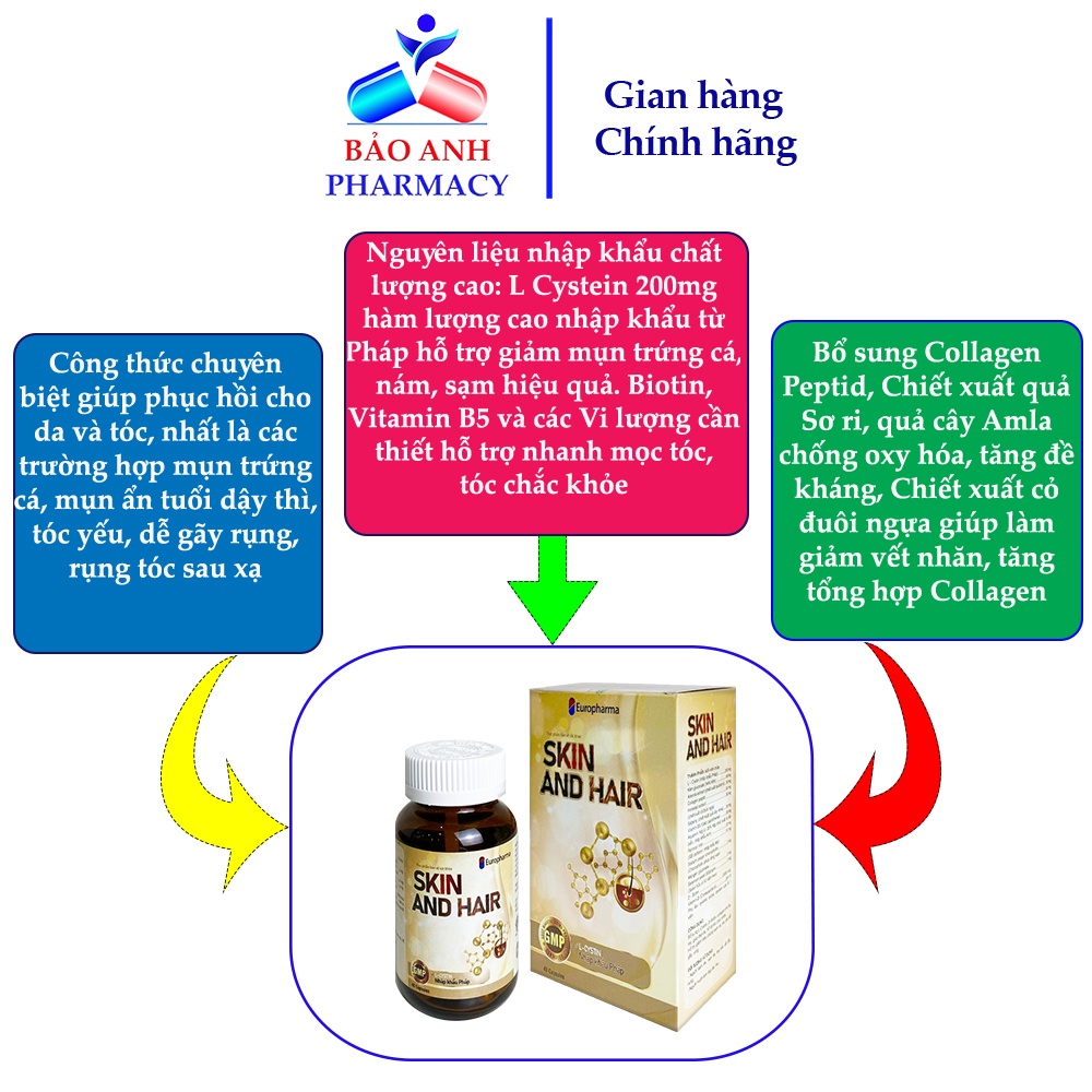 Viên uống Skin and Hair – Nguyên liệu nhập khẩu từ Pháp tốt cho người rụng tóc, tóc yếu, dễ gãy rụng, mụn trứng cá, sạm