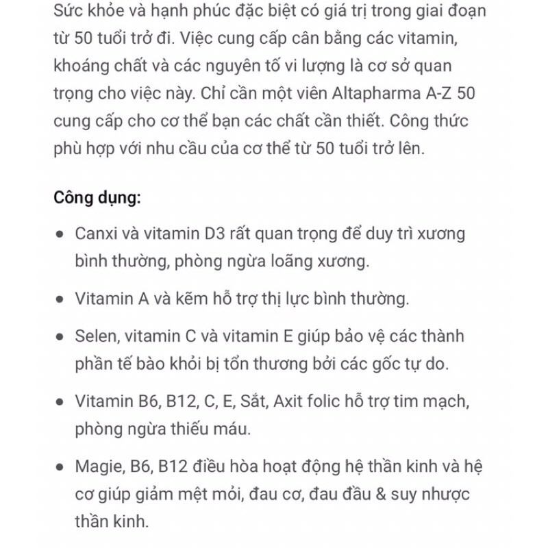 Viên uống vitamin tổng hợp cho người già Altapharma A-Z depot ab 50, 100 viên Viên uống vitamin tổng hợp cho người già Altapharma A-Z depot ab 50, 100 viên chi tiết vui lòng xem trên phần mô tả ảnh hoặc ib shop ạ. Nhà sản xuất: Altaphama Xuất xứ: Đức Nhà Nhập khẩu: