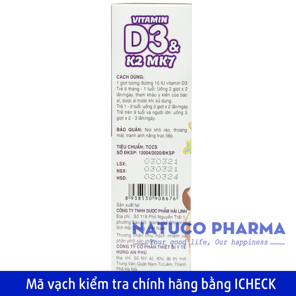 Vitamin D3 K2 Mk7 giúp bé hấp thụ canxi tăng trưởng chiều cao, nhanh mọc răng dạng nhỏ giọt tiện dụng- Lọ 10ml Công dụng - Vitamin D3 K2 Mk7 nhỏ giọt bổ sung hàm lượng vitamin D cần thiết cho trẻ em, phòng ngừa các chứng bệnh do thiếu vitamin D gây ra. - Tăng cường hấp thu canxi và Photpho, hỗ trợ xương phát triển chắc khỏe - Phòng chống còi xương, giảm các chứng chân vòng kiềng, chân đi lẻo khẻo,... - Vitamin D3 tăng phát triển chiều cao cho trẻ em, và củng cố xương khớp để bé tự tin, năng động, - Kích thích mọc răng đúng thời kỳ, giúp răng chắc khỏe Bổ sung đủ vitamin D 3 còn giúp duy trì hệ thần kinh khỏe mạnh, giảm tình trạng quấy khóc đêm, co giật,... - Vitamin d3 dạng nhỏ giọt duy trì nồng độ canxi trong máu, điều hòa chức năng gen, hỗ trợ hệ miễn dịch, và ảnh hưởng đến bài tiết insulin, hormone. Đối tượng nên sử dụng: ✬ Trẻ em thiếu vitamin D3, xương nhỏ, còi xương ✬ Chậm phát triển chiều cao, chậm mọc răng ✬ Trẻ biếng ăn, khóc đêm nhiều ✬ Trẻ em tuổi phát triển, muốn xương to, chắc khỏe Cách dùng vitamin d3 dạng giọt 1 Giọt tương đương 10 IU vitamin D3 Trẻ 6 tháng-1 tuổi: Uống 2 giọt x 2 lần/ ngày Trẻ 1-9 tuổi: Uống 3 giọt x 2 lần/ ngày Trẻ trên 9 tuổi và người lớn: uống 3 giọt x 2 lần/ ngày Sản phẩm được cấp phép bởi Bộ y tế, phân phối chính hãng tại NATUCO PHARMA Vui lòng liên hệ shop để được hỗ trợ nhanh nhất về sản phẩm và đơn hàng Thương nhân chịu trách nhiệm sản phẩm: Công ty Cổ phần thiết bị y tế Hưng an Phú Địa chỉ: 42, KĐT TRung Văm, Nam Từ Liêm , Hà Nội Xuất Xứ: Việt Nam #VitaminD3 #vitaminDchobe sản phẩm không phải là thuốc, không có tác dụng thay thế thuốc chữa bệnh
