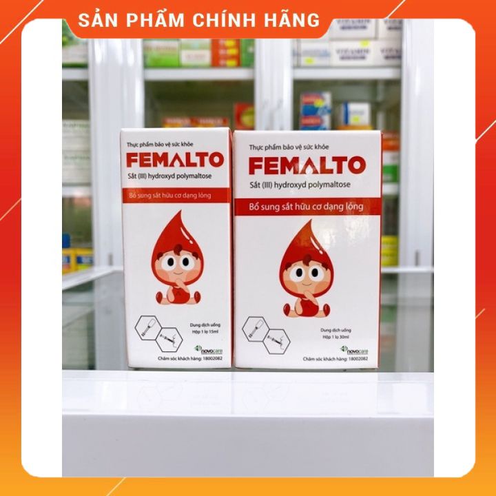 Shop xin giới thiệu bạn sản phẩm: Femalto - Vitamin Sắt Hữu Cơ Bổ Sung Sắt Cho Trẻ Em, Bà Bầu Mang Thai, Người Thiếu Sắt Sản phẩm bảo vệ sức khỏe Femalto 15ml đã được nghiên cứu lâm sàng, chứng nhận an toàn: Không gây kích ứng dạ dày, không gây buồn nôn, táo bón các tác dụng phụ khác do sắt tự do gây ra 1. Thành phần mỗi ml chứa. Sắt nguyên tố (dưới dạng phức hợp Sắt (III) hydroxyd polymaltose) Phụ gia: Đường, chất ổn định 2. Công dụng. - Vitamin Hỗ trợ bổ sung cải thiện thiếu máu do thiếu sắt. 3. Đối tượng sử dụng; - Hỗ trợ trẻ em, phụ nữ mang thai, cho con bú, người lớn thiếu máu thiếu sắt, da xanh xao, nhợt nhạt - Hỗ trợ Phụ nữ đa kinh, rong kinh, người mất máu do chấn thương - Hỗ Người có chế độ ăn thiếu sắt hoặc khả năng hấp thu sắt kém 4. Cách dùng: Liều dùng và thời gian phụ thuộc vào mức độ thiếu hụt săt: - Trẻ dưới 1 tuổi : 0,5ml/ ngày ( tương đương 7 giọt) - Trẻ em 1-12 tuổi : 0,5-1ml/ ngày ( tương đương 7-14 giọt) - Người lớn và trẻ em trên 12 tuổi: 1-2ml/ngày - Trường hợp thiếu sắt nặng: 2ml/ngày ** Lưu ý. Sản phẩm này không phải là thuốc, không có tác dụng thay thế thuốc chữa bệnh.