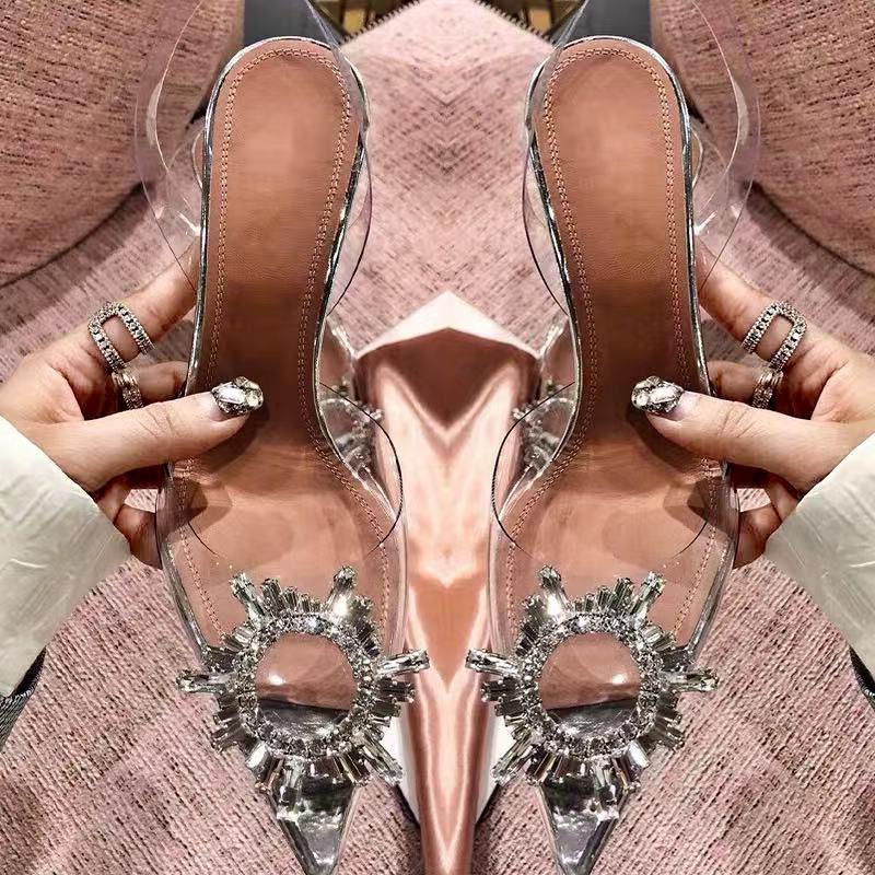 Xăng đan cao gót mũi nhọn đính đá trong suốt phong cách mùa hè 2021 sang trọng cho nữ