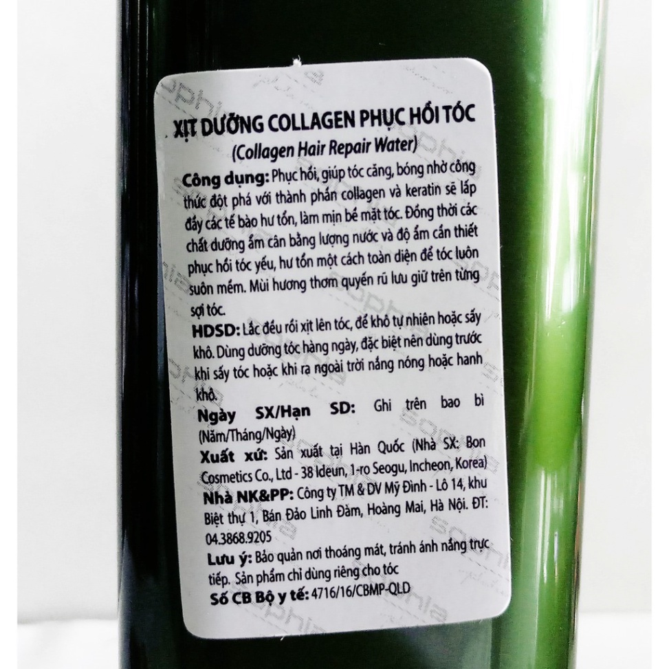 Xịt dưỡng tóc SOPHIA Hàn Quốc 250ml (phục hồi tóc hư tổn-Collagen Hair Repair Water) -Dung tích : 250ml -Xuất Xứ : Hàn Quốc -Thương hiệu : Sophia ***Thông tin sản phẩm: Phục hồi giúp tóc căng bóng nhờ công thức đột phá với thành phần collagen và keratine sẽ lấp đầy c