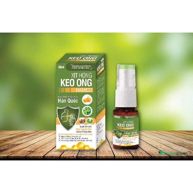XỊT HỌNG KEO ONG HAMICO - Thành phần: Propolis (Keo Ong) 100mg Mật Ong 100mg Tinh dầu bạc hà 0.96g Bromelain 50mg Cao Khô Lá Thường Xuân 500mg Nano bạc 0.2% Xuyên Tâm Liên 500mg Đông Trùng Hạ Thảo 50mg - Chỉ định: Dùng cho người bị đau họng, sưng họng, ngứa rát cổ họng, viêm họng, ho kéo dài, ho do cảm lạnh, cảm cúm. - Liều lượng và cách dùng: Lắc đều trước khi sử dụng, đưa đầu vòi vào khoang miệng, có thể hướng đầu vòi phun sâu vào trong miệng, ấn liên tục 2-5 nhịp 1 lần xịt. Ngày xịt 3-4 lần hoặc nhiều hơn khi cần thiết. Sản phẩm có thể nhổ ra hoặc nuốt vào không gây nguy hại tới sức khỏe người sử dụng - Chống chỉ định: Không sử dụng với người mẫn cảm bất kỳ thành phần nào của sản phẩm. Sản phẩm này không phải là thuốc, không thay thế thuốc chữa bệnh