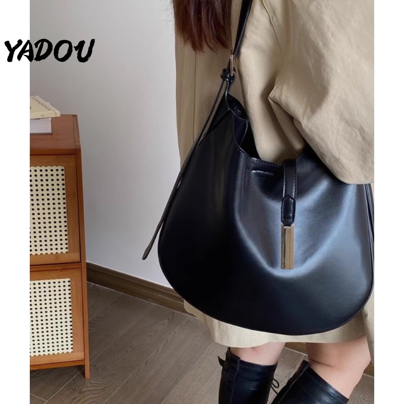 Yadou Túi Xách Da PU Màu Đen Sức Chứa Lớn Hình Bán Nguyệt Phong Cách Hàn Quốc