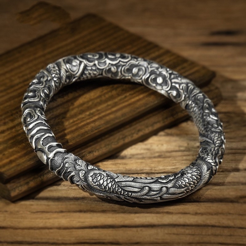 Yunnnan Vòng Tay Bạc Họa Tiết Rồng Thủ Công Phong Cách Dân Tộc Độc Đáo Cho Nam Và Nữ