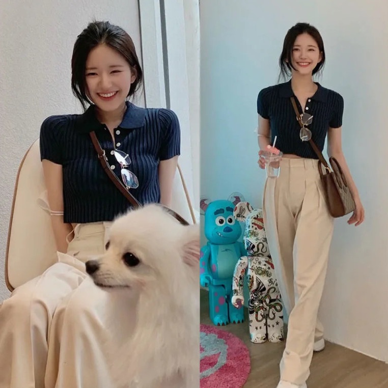 ✙✁❀Zhao Lusi Áo Thun Dệt Kim Tay Ngắn Cổ POLO Màu Xanh Navy Dáng Ôm Dành Cho Bạn Nữ